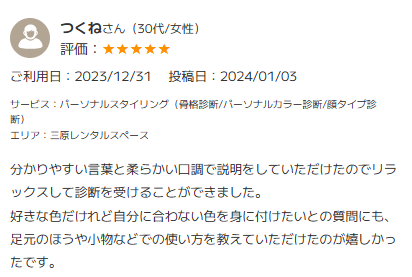 パーソナルスタイリング(骨格診断/パーソナルカラー診断/顔タイプ診断)@三原レンタルスペース