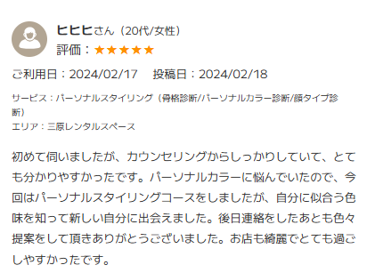 初めて伺いましたが、カウンセリングからしっかりしていて、とても分かりやすかったです。パーソナルカラーに悩んでいたので、今回はパーソナルスタイリングコースをしましたが、自分に似合う色味を知って新しい自分に出会えました。後日連絡をしたあとも色々提案をして頂きありがとうございました。お店も綺麗でとても過ごしやすかったです。
