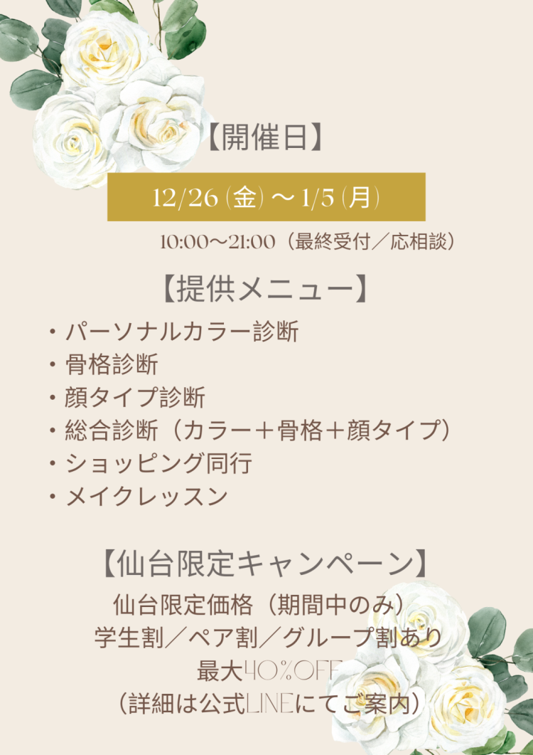今年の冬も、仙台でパーソナルカラー診断・骨格診断・顔タイプ診断・ファッション同行の出張イベントを開催いたします。