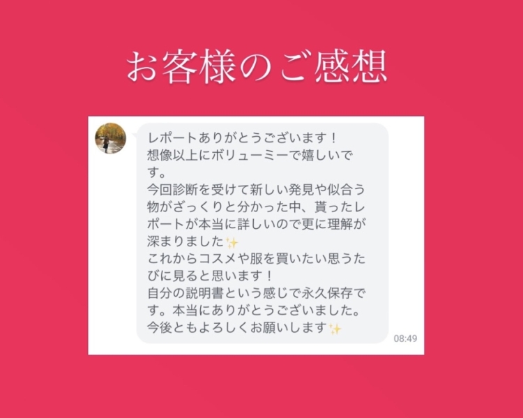当サロンは必ずセットメニュー受講のお客様へサンプル資料ではなく【貴方だけ】の35枚以上のイメージコンサルティングレポートをお送りしています。